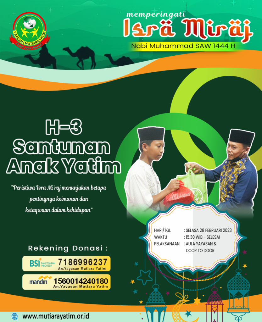 Bismillahirrahmanirrahim. Tidak terasa kurang dari 3 hari lagi Yayasan Mutiara Yatim akan memperingati Isra Mi’raj Nabi Muhammad Saw 1444H dan