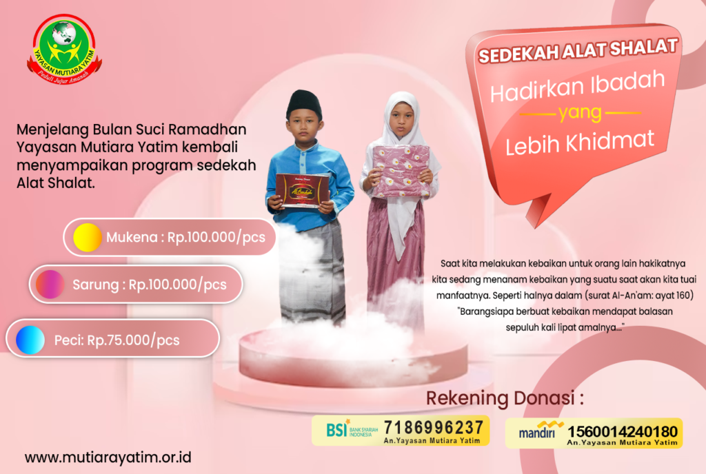 SEDEKAH ALAT SHALAT – Menyambut bulan suci Ramadhan yayasan mutiara yatim berikhtiar untuk memberikan perlengkapan shalat yang layak untuk anak